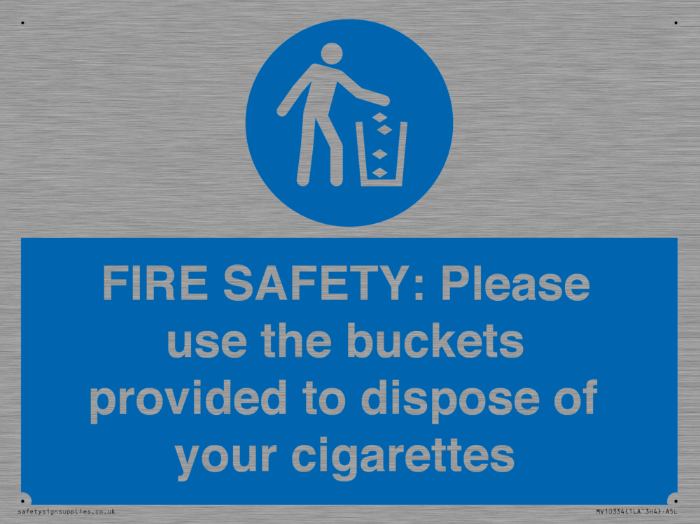 FIRE SAFETY: Please use the buckets provided to dispose of your cigarettes Sign