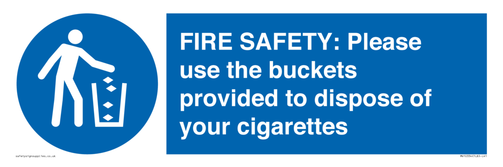 FIRE SAFETY: Please use the buckets provided to dispose of your cigarettes Sign