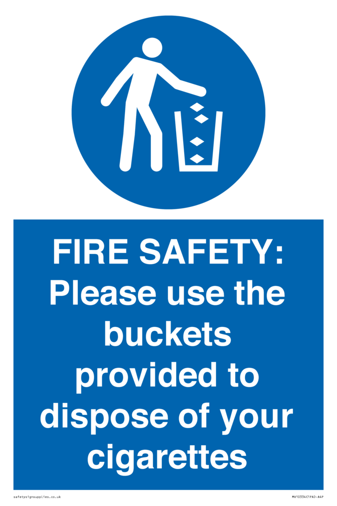 FIRE SAFETY: Please use the buckets provided to dispose of your cigarettes Sign