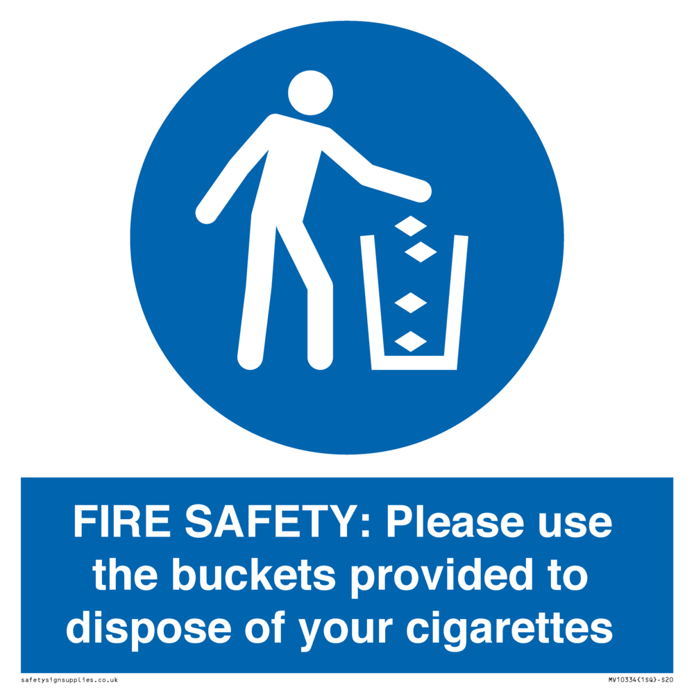 FIRE SAFETY: Please use the buckets provided to dispose of your cigarettes Sign