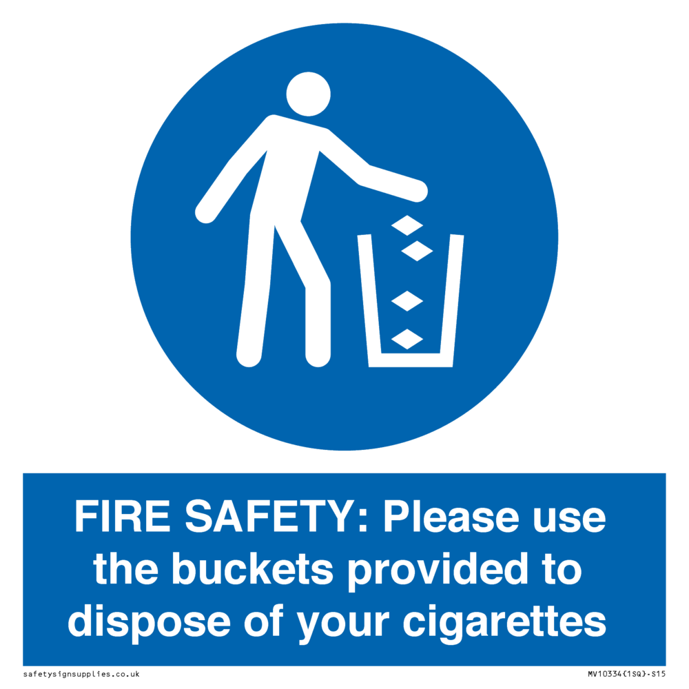 FIRE SAFETY: Please use the buckets provided to dispose of your cigarettes Sign