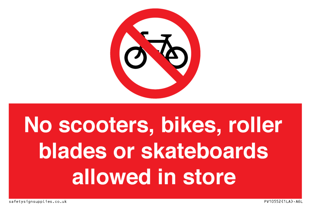 No scooters, bikes, roller blades or skateboards allowed in store Sign