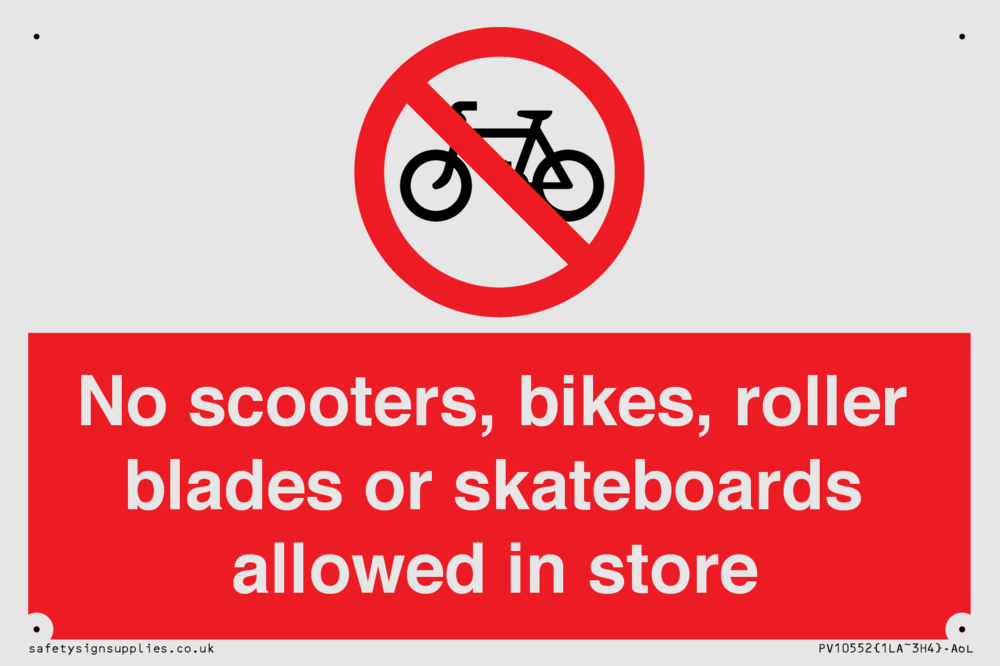 No scooters, bikes, roller blades or skateboards allowed in store Sign