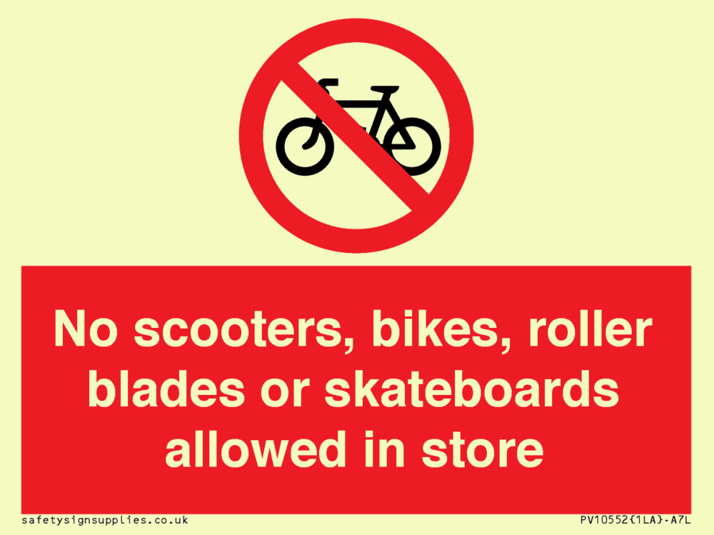 No scooters, bikes, roller blades or skateboards allowed in store Sign