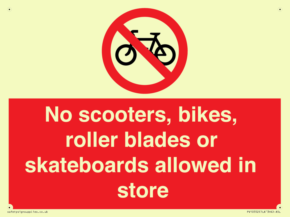 No scooters, bikes, roller blades or skateboards allowed in store Sign