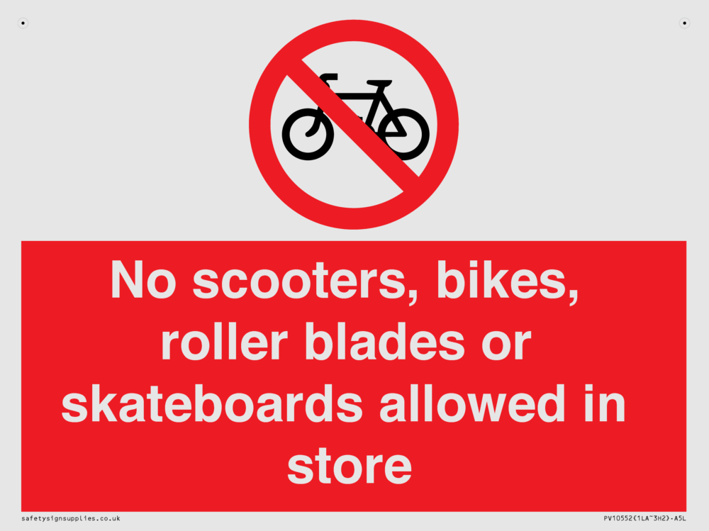 No scooters, bikes, roller blades or skateboards allowed in store Sign