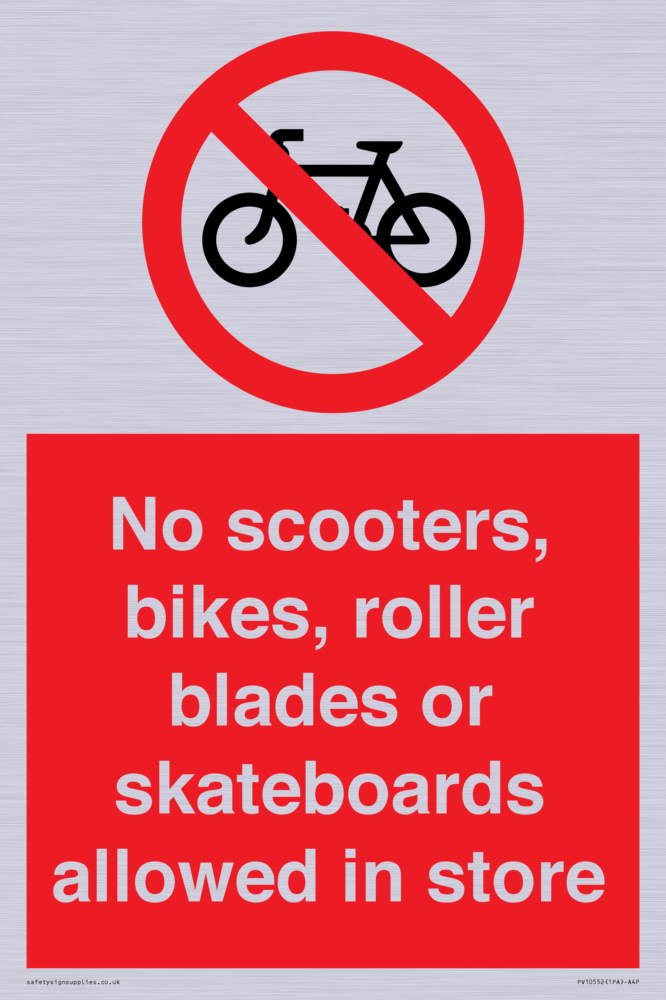 No scooters, bikes, roller blades or skateboards allowed in store Sign