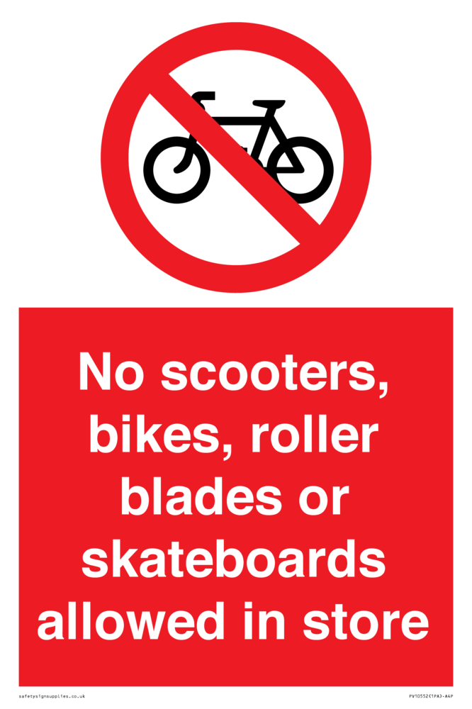 No scooters, bikes, roller blades or skateboards allowed in store Sign