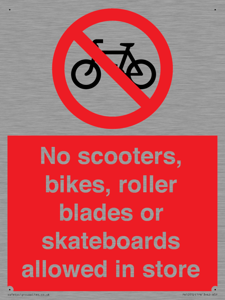 No scooters, bikes, roller blades or skateboards allowed in store Sign