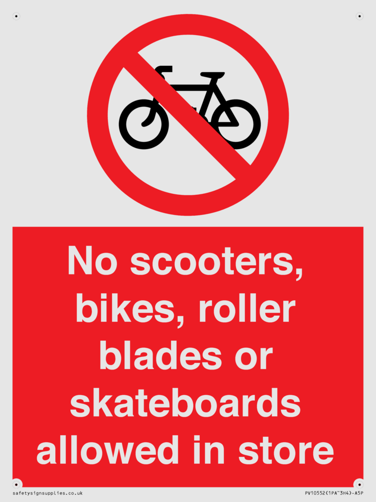 No scooters, bikes, roller blades or skateboards allowed in store Sign