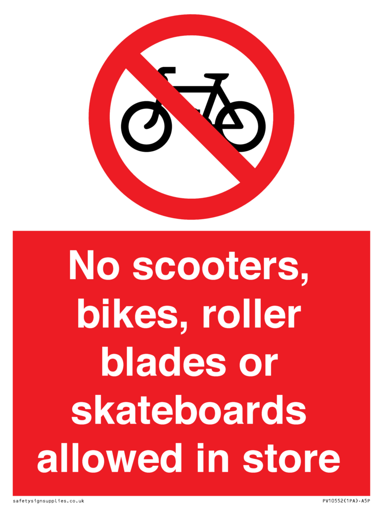 No scooters, bikes, roller blades or skateboards allowed in store Sign