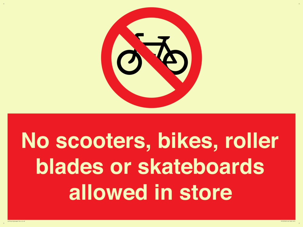 No scooters, bikes, roller blades or skateboards allowed in store Sign