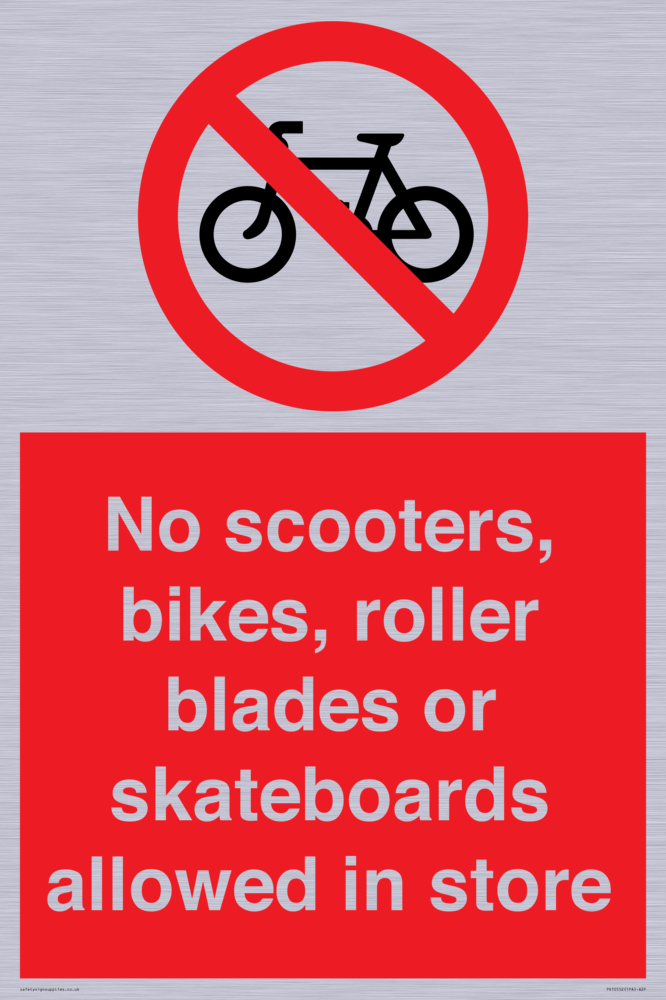 No scooters, bikes, roller blades or skateboards allowed in store Sign