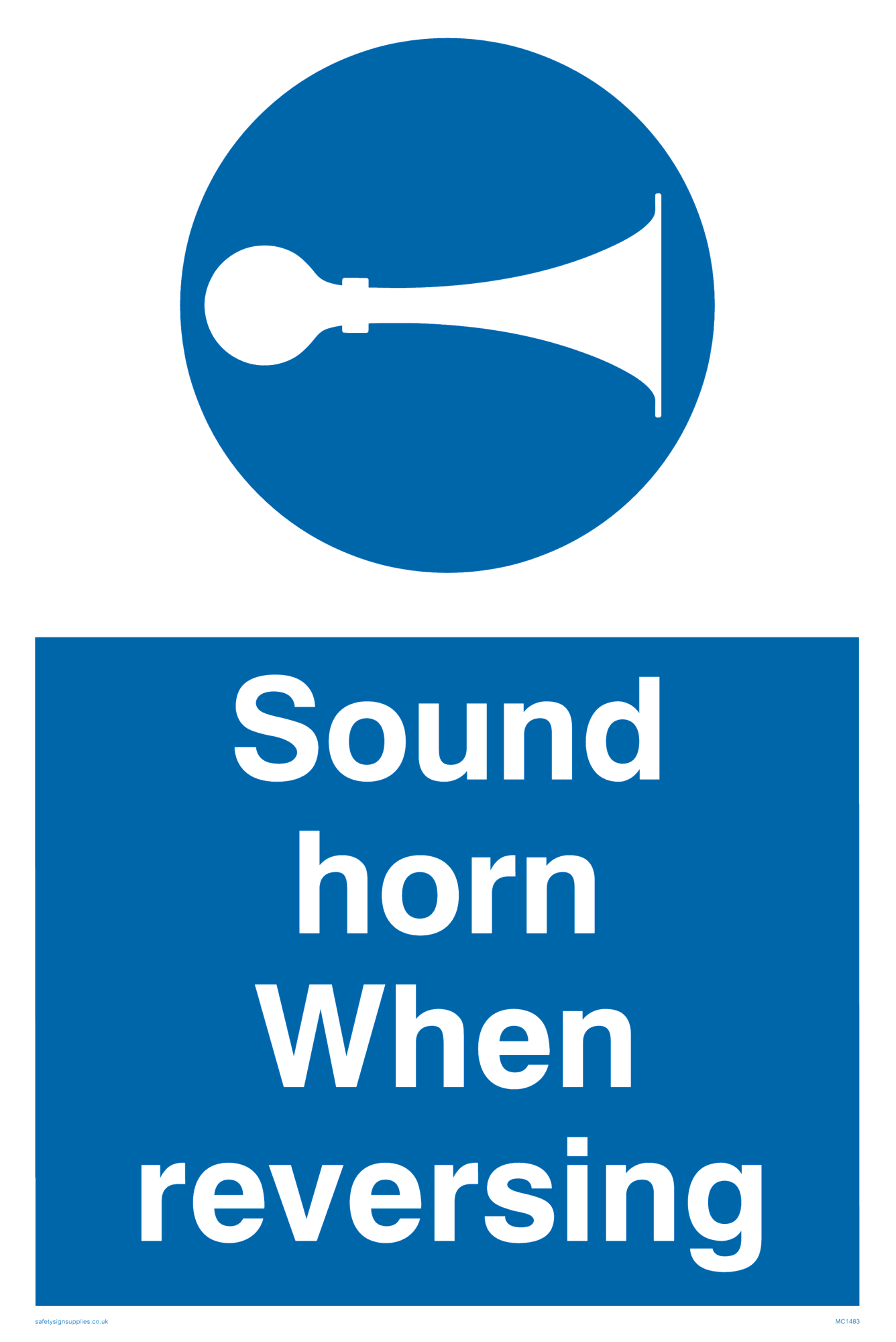 This sign contains a horn symbol. This is usually used to instruct people to sound there horn when reversiging or telling a particular vehicle, like a fork-lift must sound their horn. Comes with a self adhesive backing.