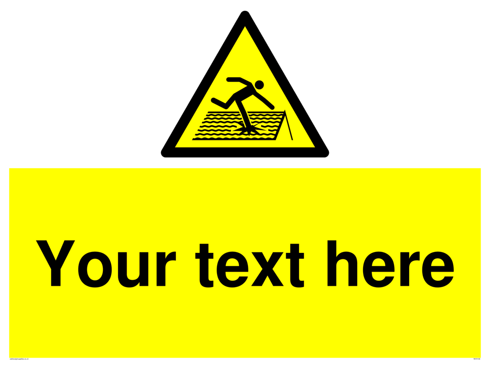 This sign contains a fragile roof warning symbol. Person tripping / walking on damaged roof in black on yellow warning triangle with border in black.