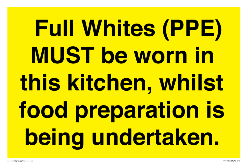 Full Whites (PPE) MUST be worn in this kitchen, whilst food preparation is being undertaken. Sign