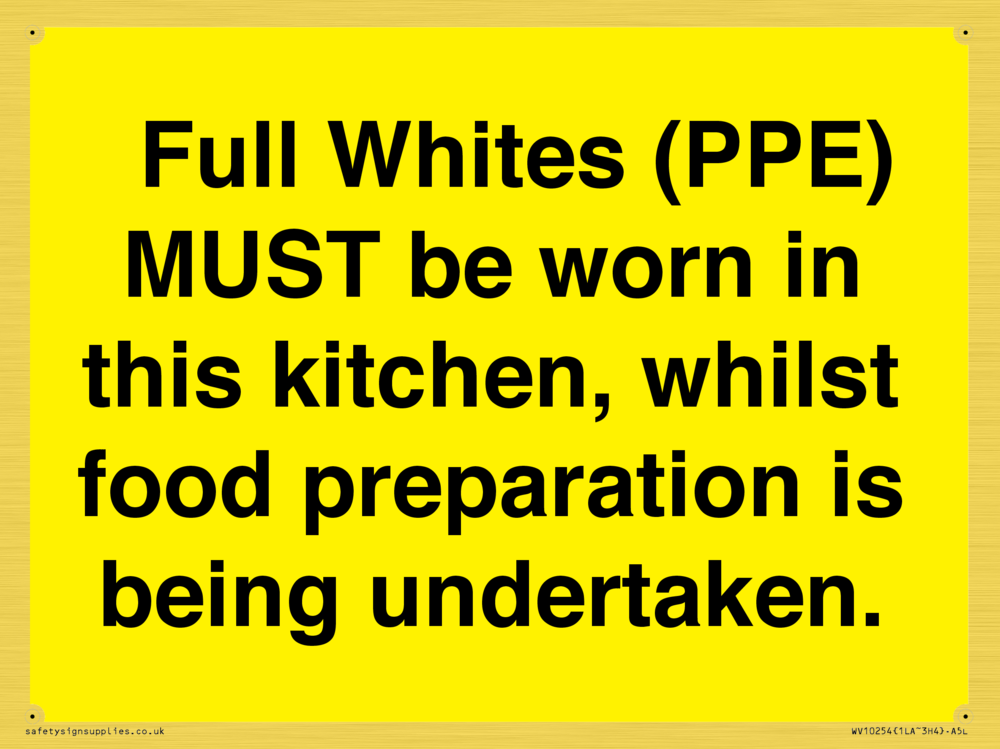 Full Whites (PPE) MUST be worn in this kitchen, whilst food preparation is being undertaken. Sign