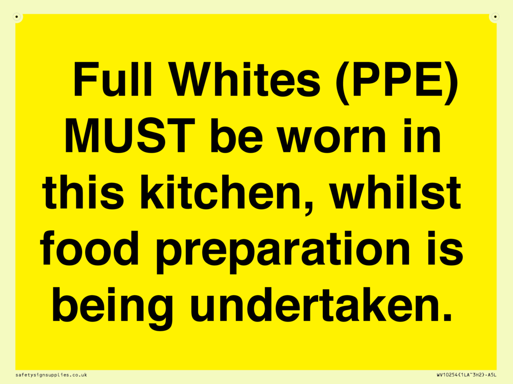 Full Whites (PPE) MUST be worn in this kitchen, whilst food preparation is being undertaken. Sign