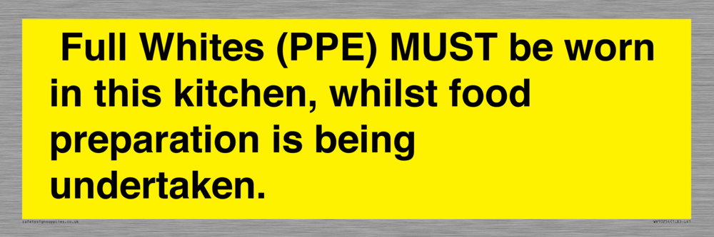 Full Whites (PPE) MUST be worn in this kitchen, whilst food preparation is being undertaken. Sign