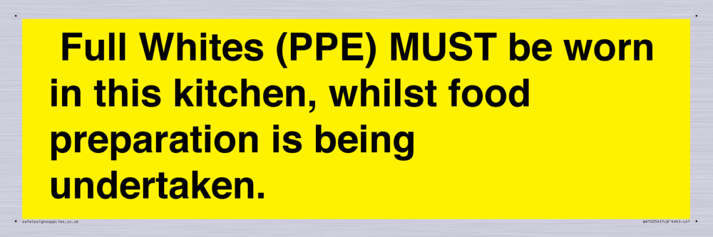 Full Whites (PPE) MUST be worn in this kitchen, whilst food preparation is being undertaken. Sign