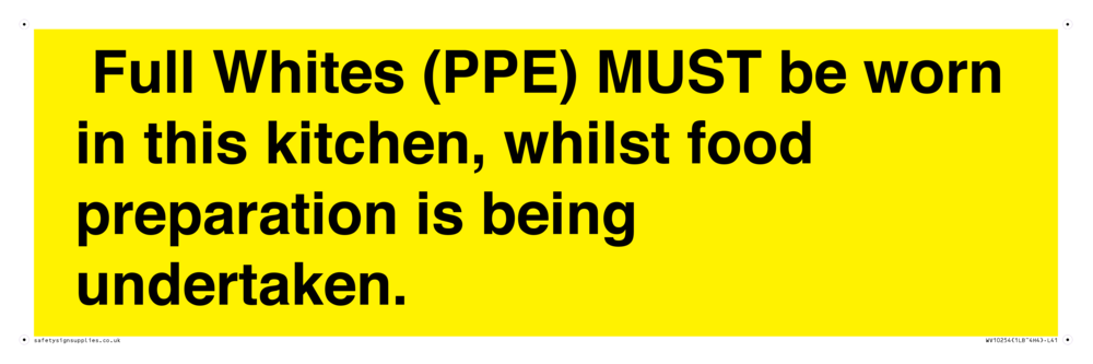 Full Whites (PPE) MUST be worn in this kitchen, whilst food preparation is being undertaken. Sign