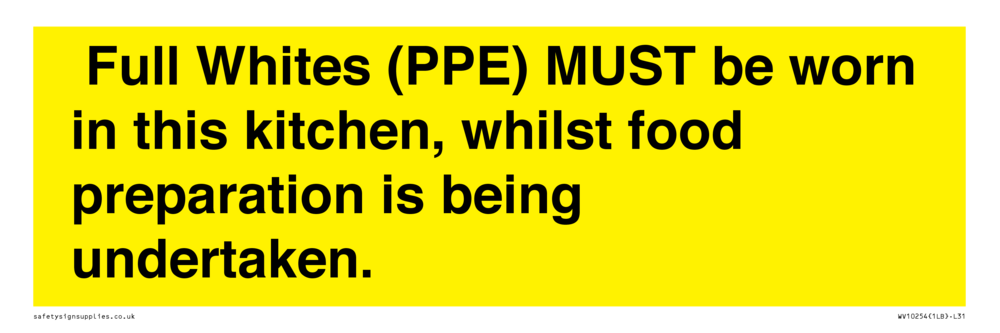 Full Whites (PPE) MUST be worn in this kitchen, whilst food preparation is being undertaken. Sign