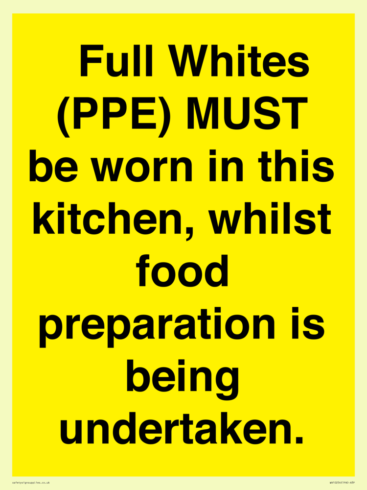 Full Whites (PPE) MUST be worn in this kitchen, whilst food preparation is being undertaken. Sign