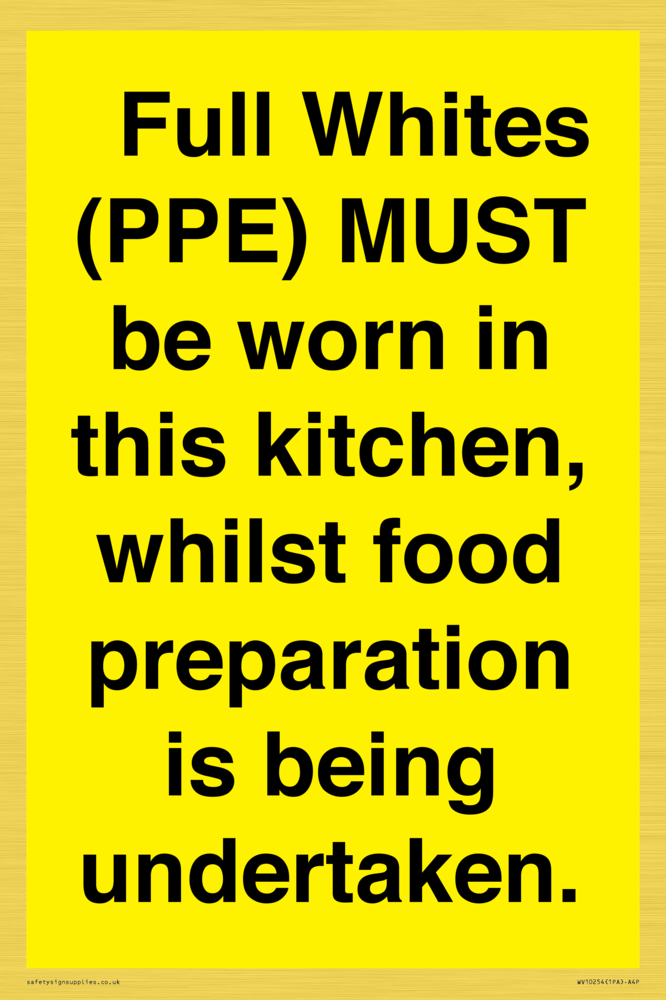 Full Whites (PPE) MUST be worn in this kitchen, whilst food preparation is being undertaken. Sign