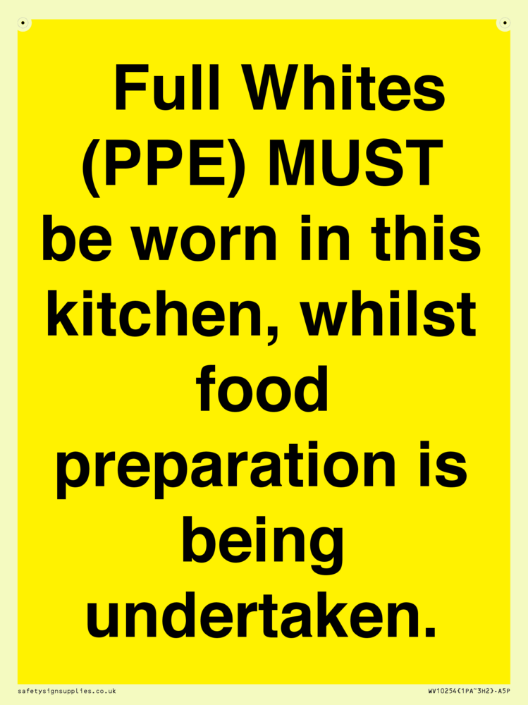 Full Whites (PPE) MUST be worn in this kitchen, whilst food preparation is being undertaken. Sign
