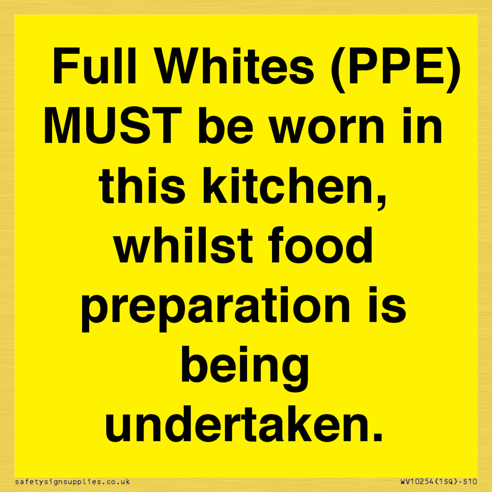 Full Whites (PPE) MUST be worn in this kitchen, whilst food preparation is being undertaken. Sign