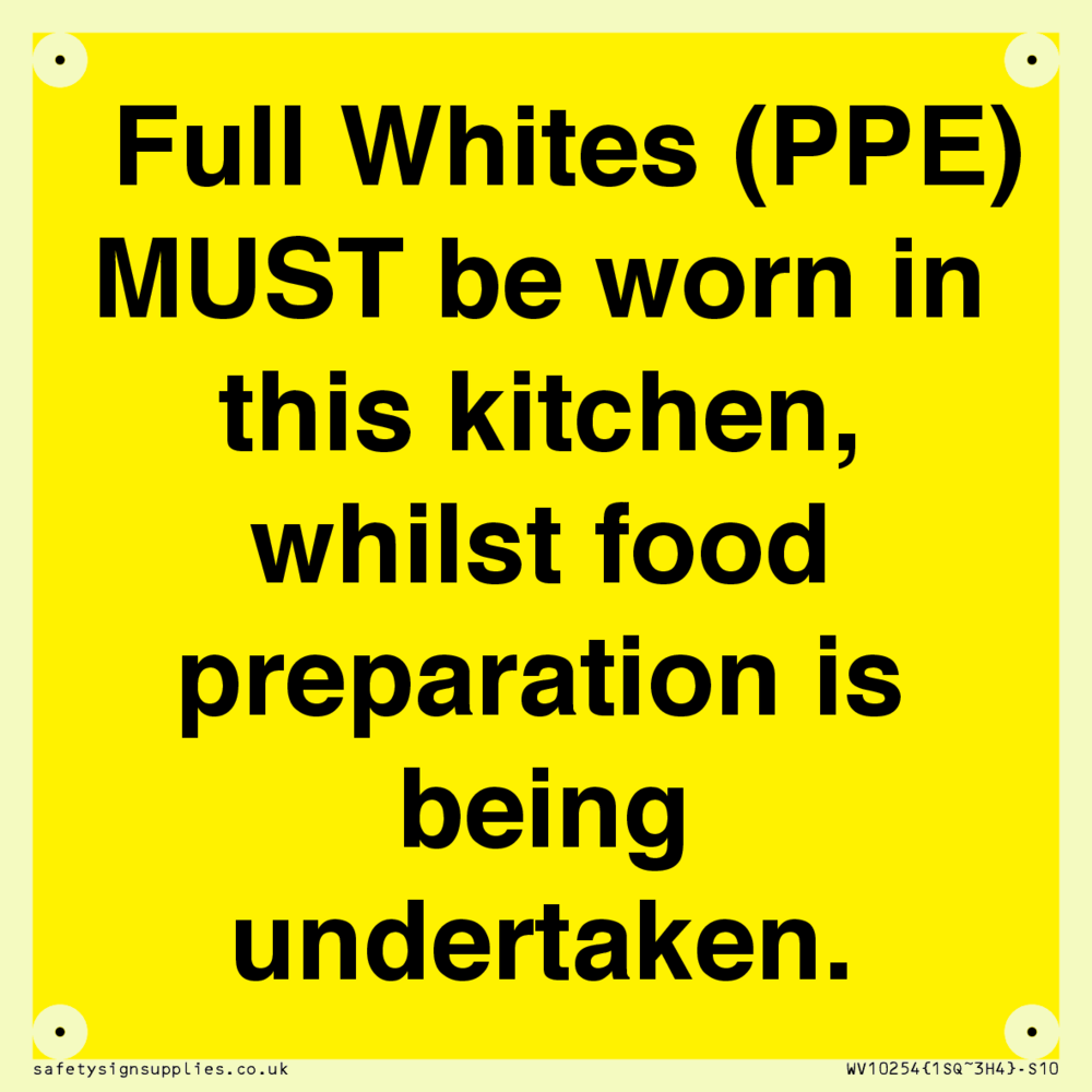 Full Whites (PPE) MUST be worn in this kitchen, whilst food preparation is being undertaken. Sign