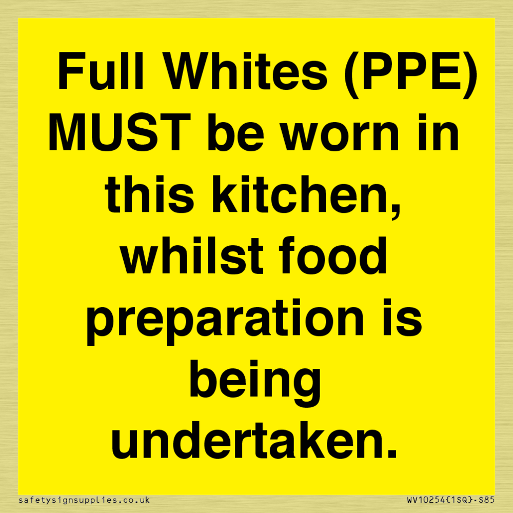 Full Whites (PPE) MUST be worn in this kitchen, whilst food preparation is being undertaken. Sign