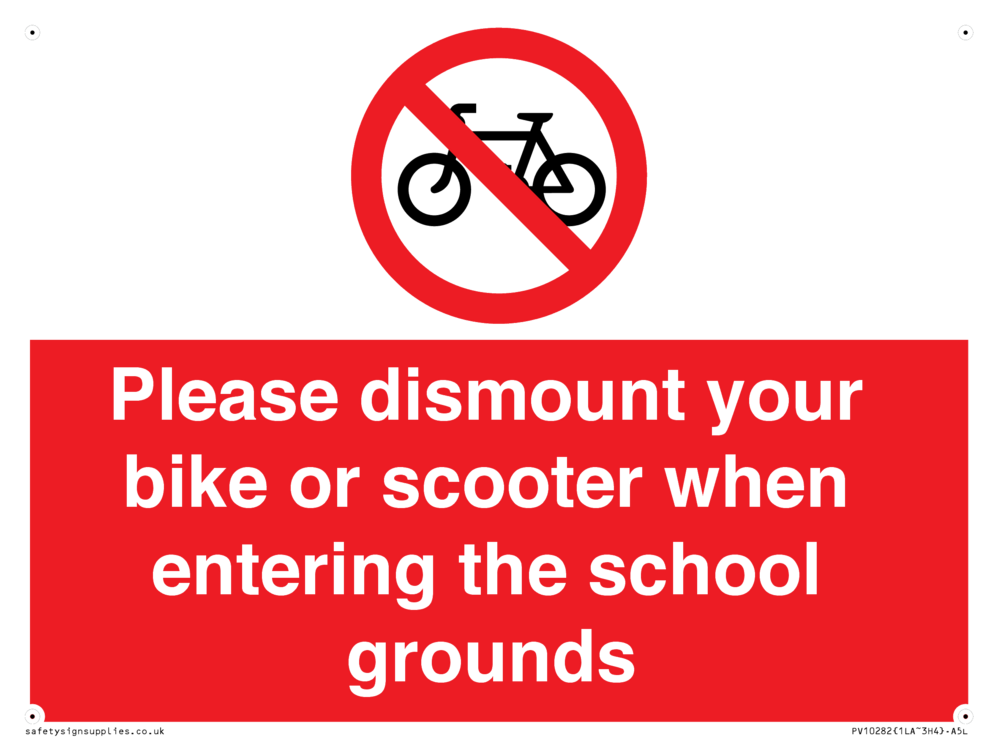 Please dismount your bike or scooter when entering the school grounds, prohibition sign