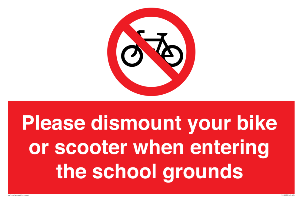 Please dismount your bike or scooter when entering the school grounds, prohibition sign