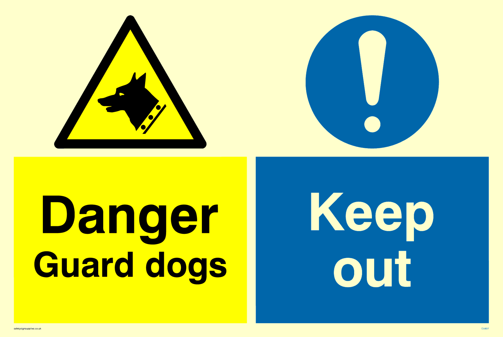 This sign contains a guard dog warning symbol. Guard dog in black on yellow warning triangle with black border.