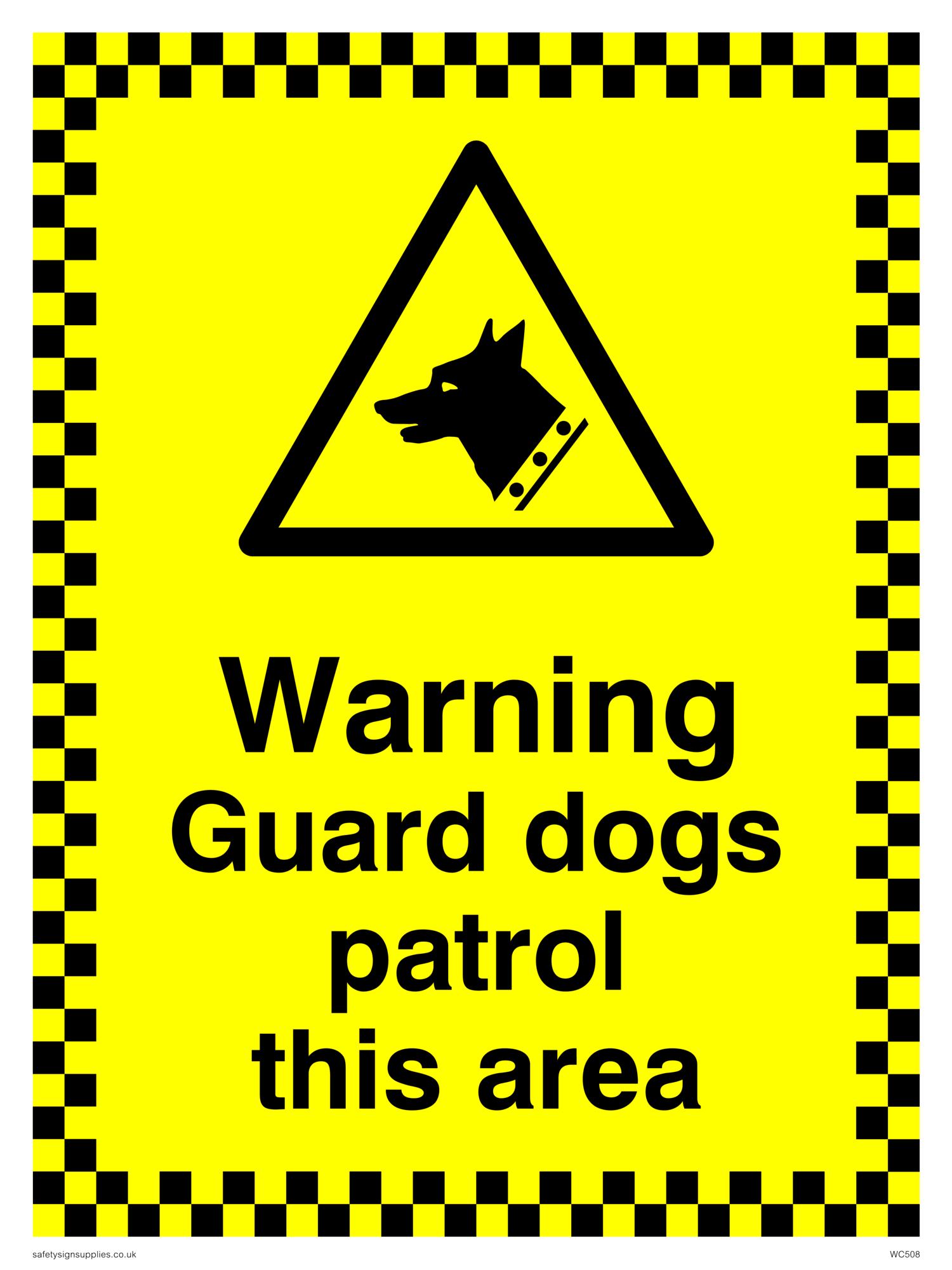This sign contains a guard dog warning symbol. Guard dog in black on yellow warning triangle with black border.