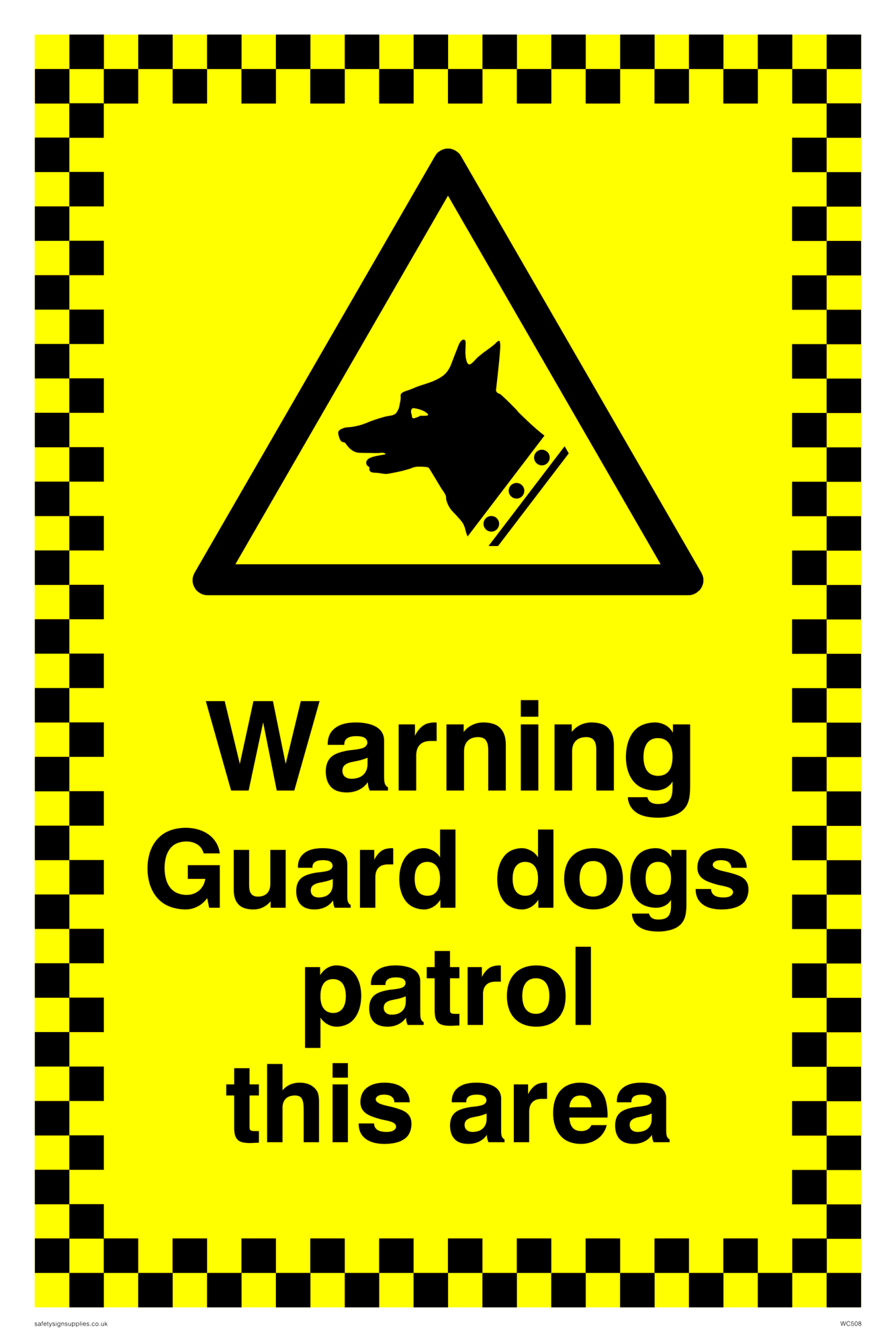 This sign contains a guard dog warning symbol. Guard dog in black on yellow warning triangle with black border.