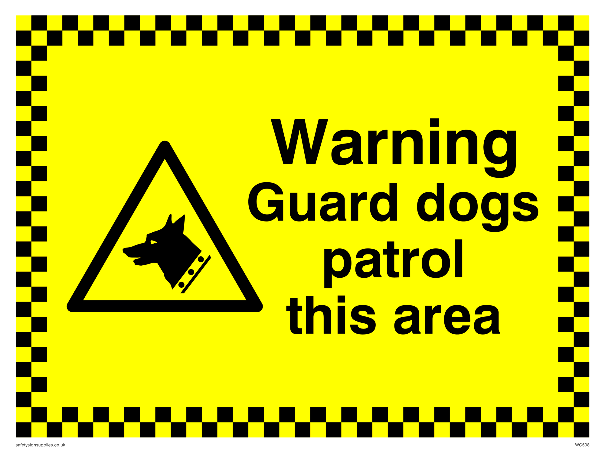 This sign contains a guard dog warning symbol. Guard dog in black on yellow warning triangle with black border.