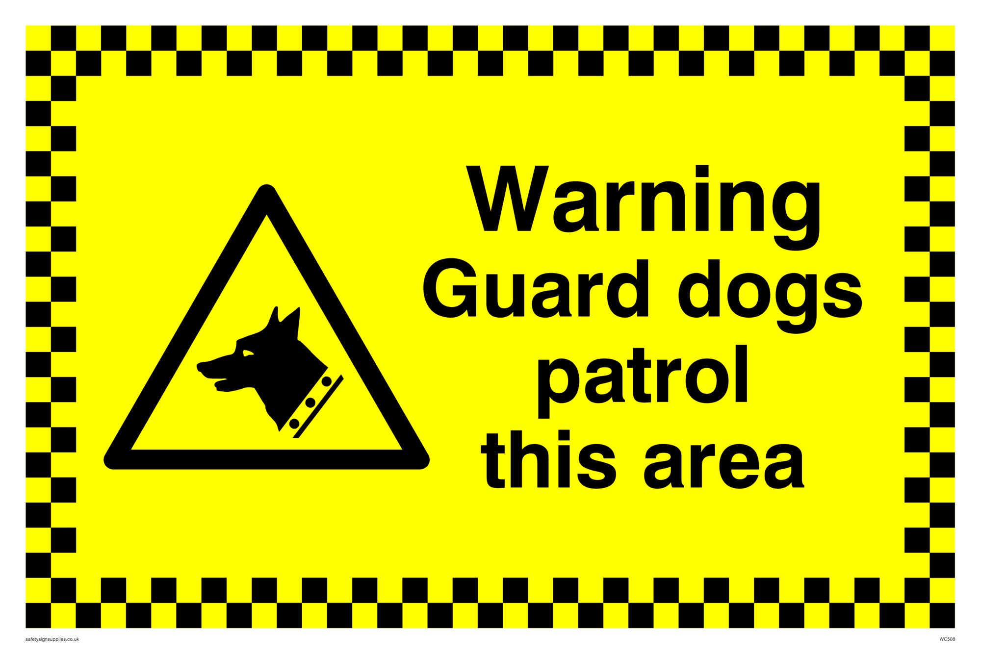 This sign contains a guard dog warning symbol. Guard dog in black on yellow warning triangle with black border.