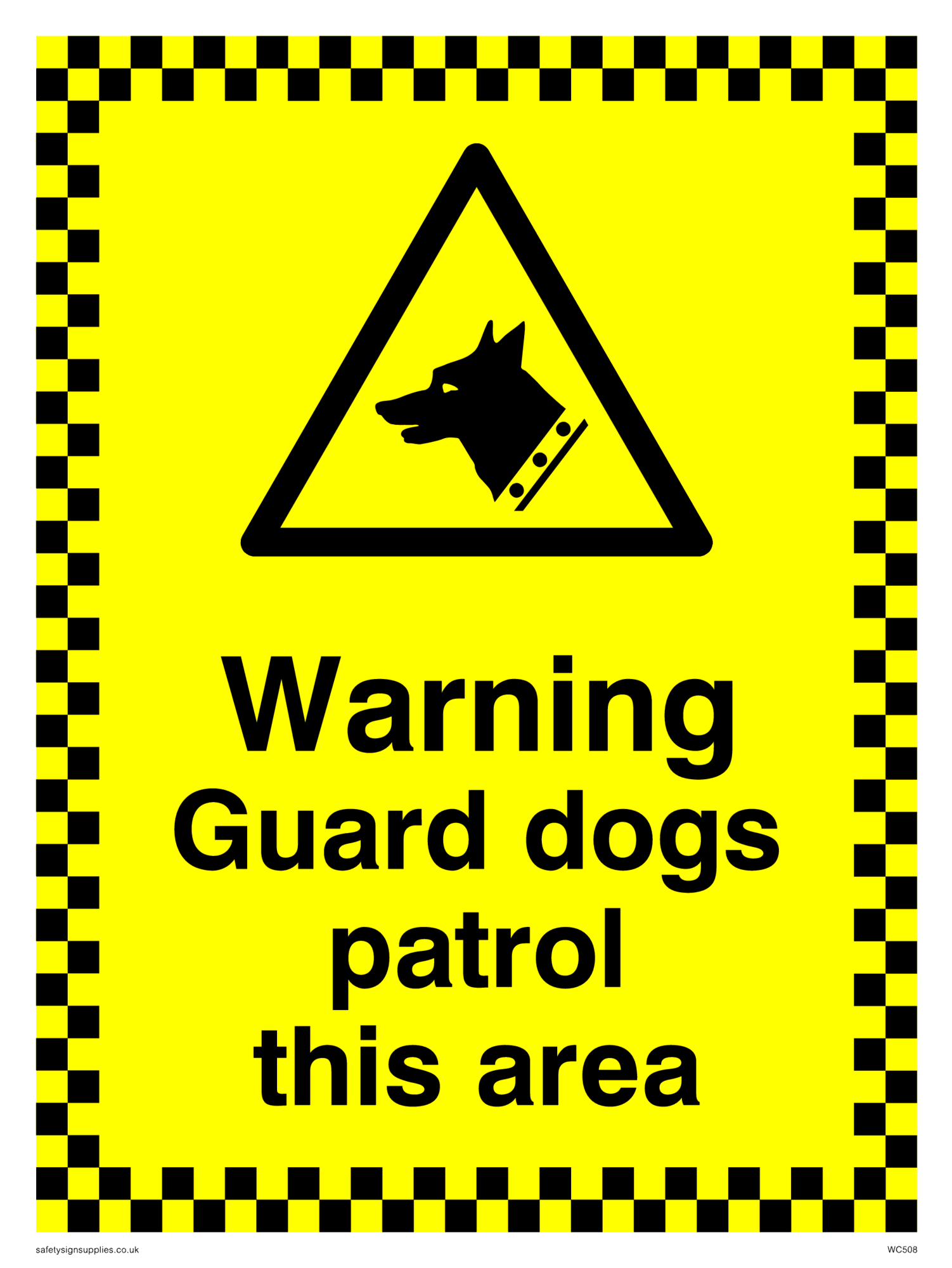This sign contains a guard dog warning symbol. Guard dog in black on yellow warning triangle with black border.