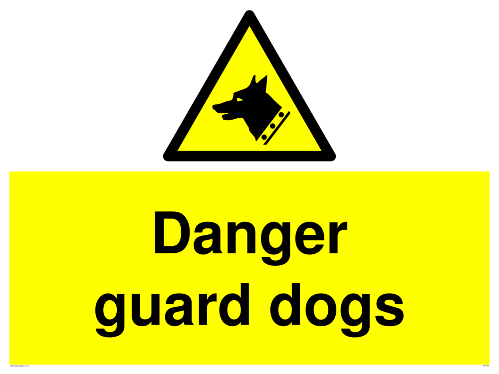 This sign contains a guard dog warning symbol. Guard dog in black on yellow warning triangle with black border.