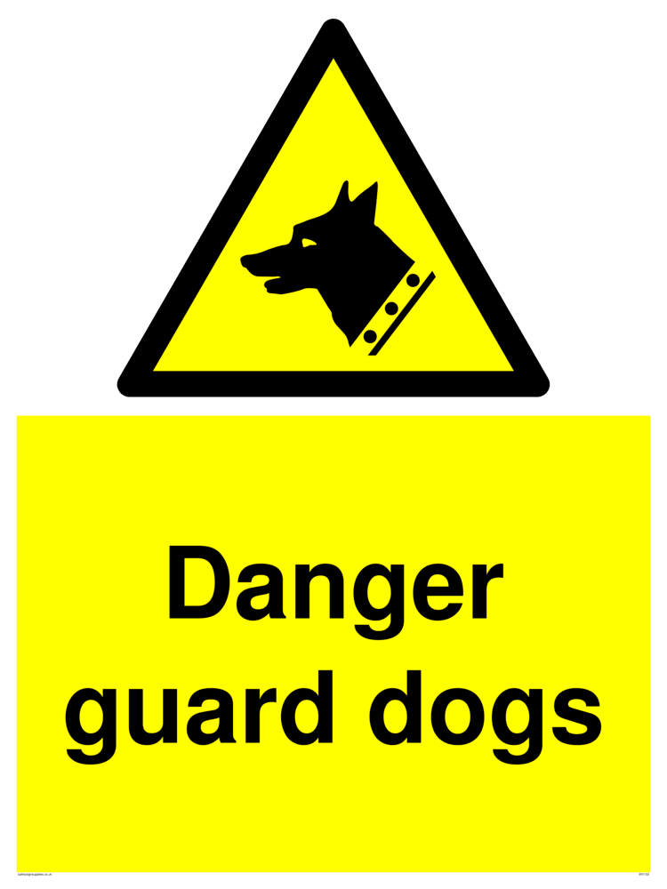 This sign contains a guard dog warning symbol. Guard dog in black on yellow warning triangle with black border.