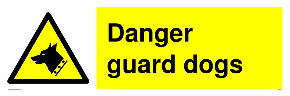 This sign contains a guard dog warning symbol. Guard dog in black on yellow warning triangle with black border.