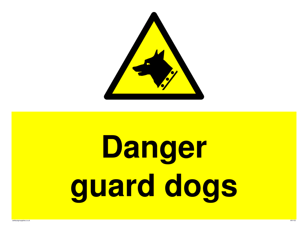 This sign contains a guard dog warning symbol. Guard dog in black on yellow warning triangle with black border.