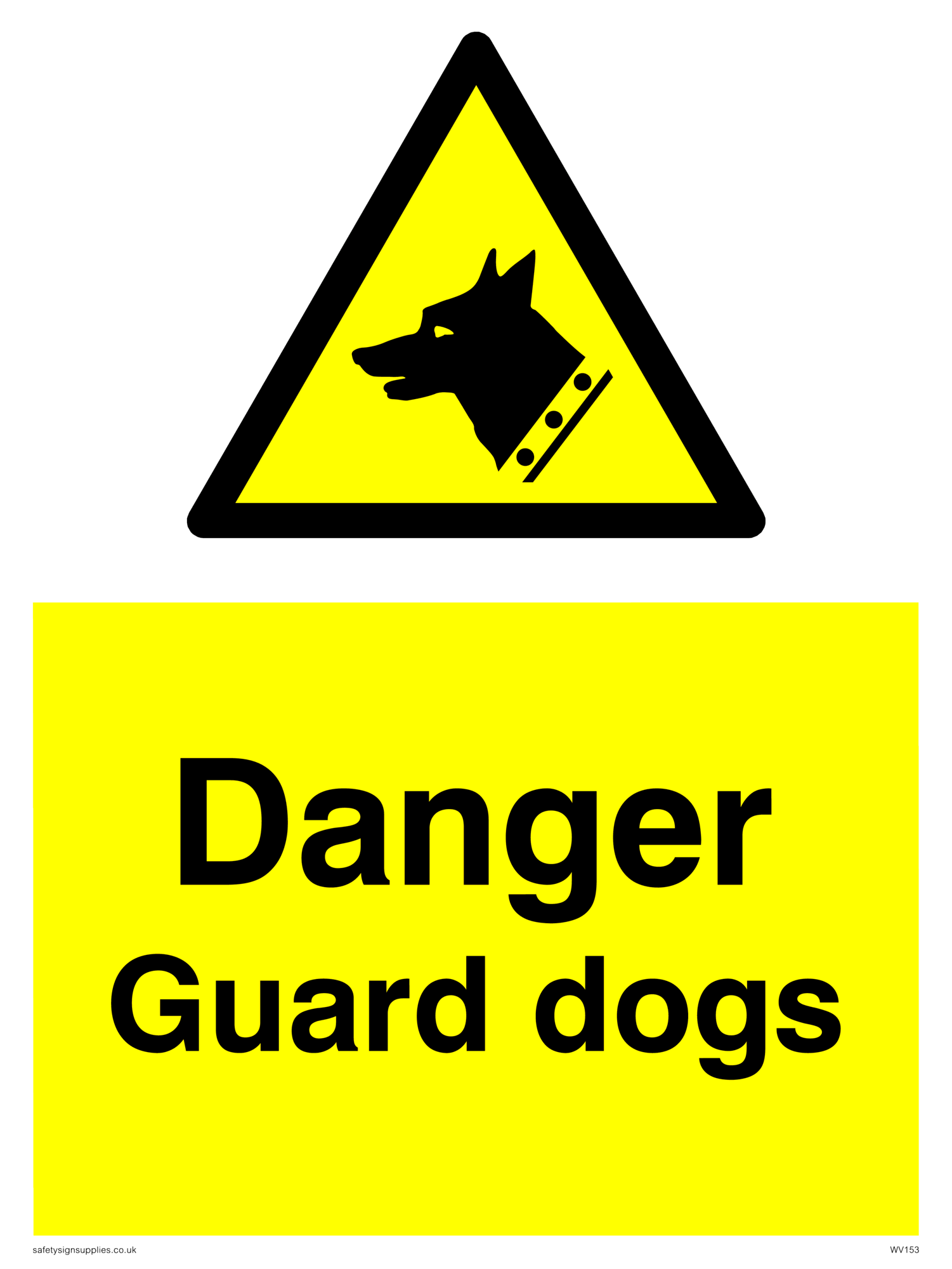 This sign contains a guard dog warning symbol. Guard dog in black on yellow warning triangle with black border.