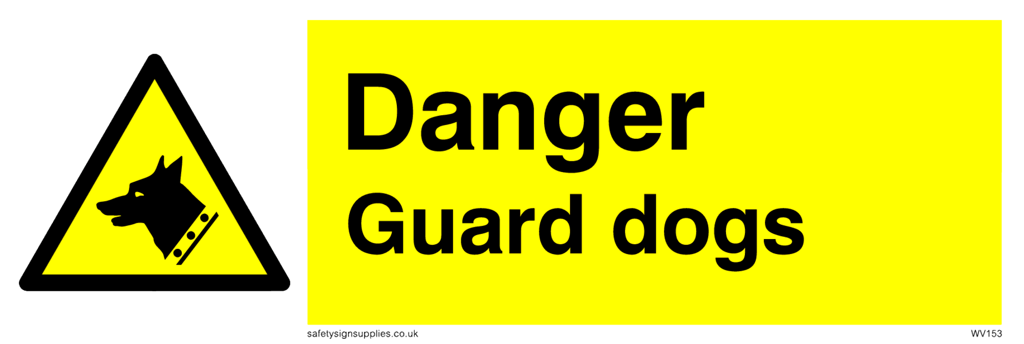 This sign contains a guard dog warning symbol. Guard dog in black on yellow warning triangle with black border.