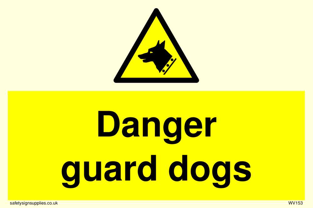 This sign contains a guard dog warning symbol. Guard dog in black on yellow warning triangle with black border.