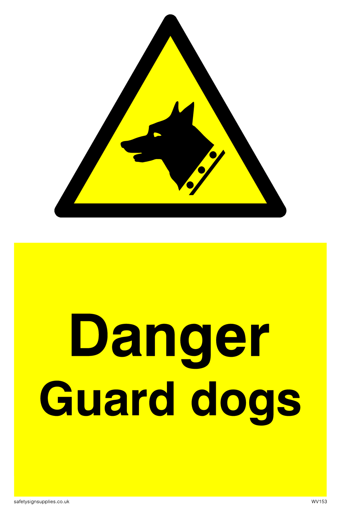 This sign contains a guard dog warning symbol. Guard dog in black on yellow warning triangle with black border.
