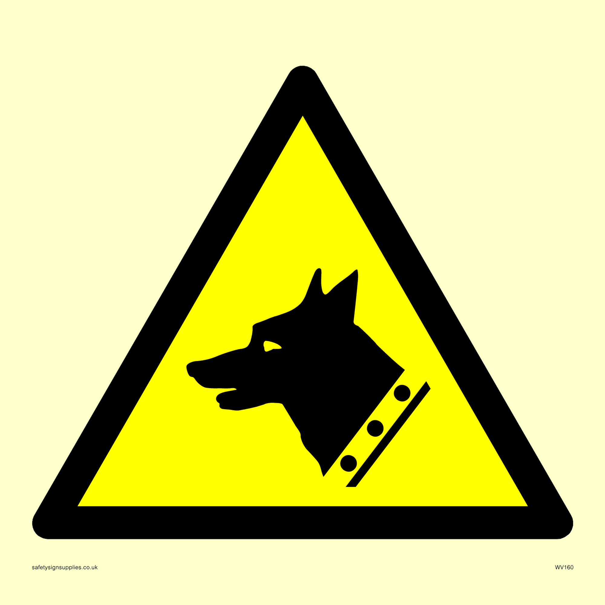 This sign contains a guard dog warning symbol. Guard dog in black on yellow warning triangle with black border.