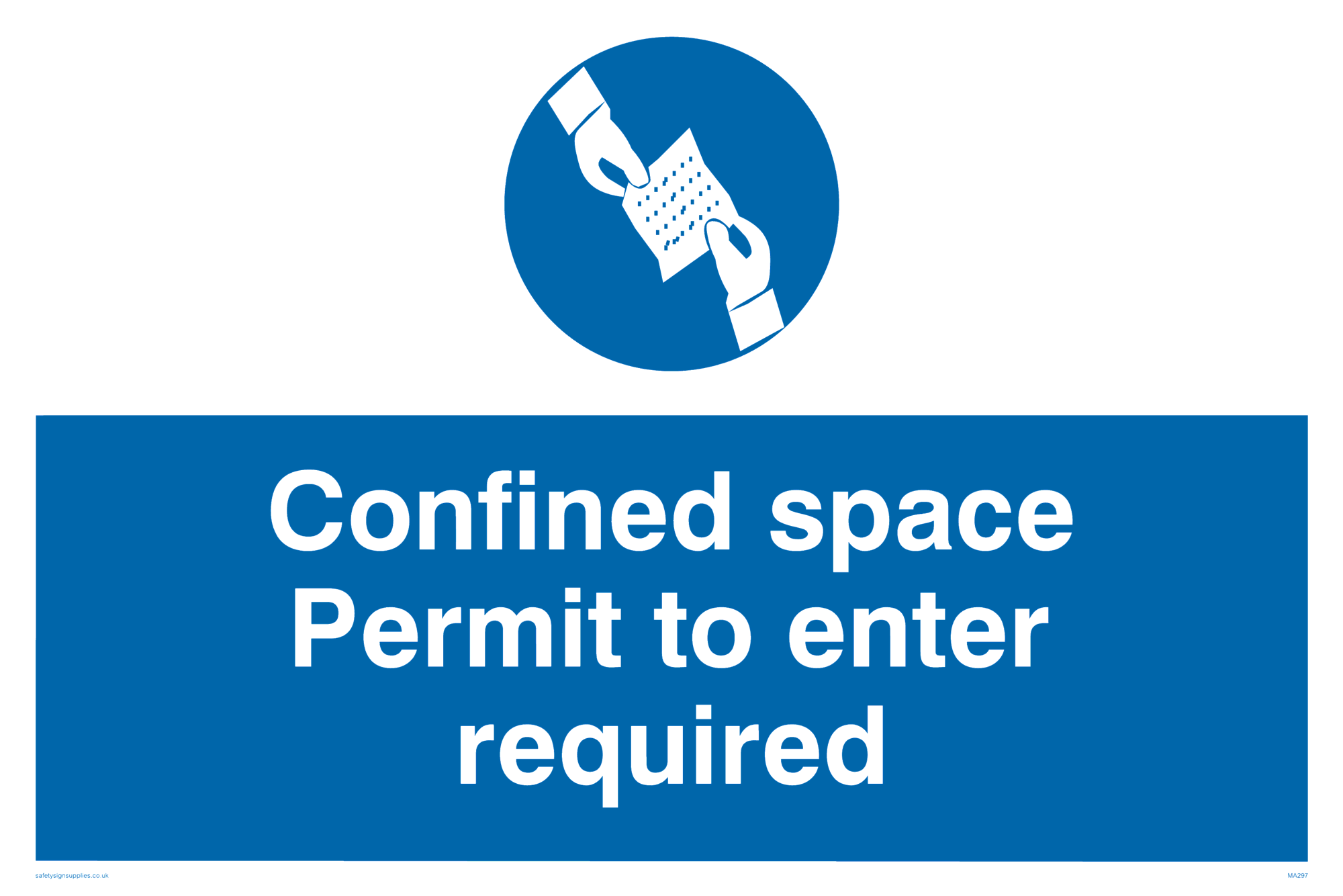 This sign contains a permit required symbol - permit / paper being passed from hand to hand in white within blue circle.